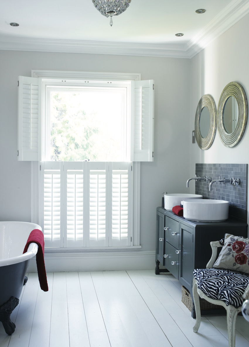 Café shutters are designed to cover only the lower portion of a window, allowing light in from above for a bright and airy room without losing privacy for the floor.